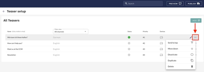 Once the teaser has been edited as desired, it can now be activated. Activation takes place either in the editor using the toggle or in the teaser overview list using the three-dot menu of the respective teaser. Deactivation is carried out in the same way as activation.
