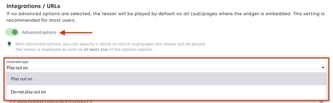 By default, the teaser is displayed on all pages where the chat widget is displayed. This can be limited by defining rules in the Integrations / URLs section.