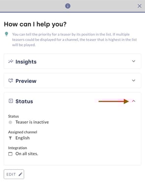 The sidebar provides access to teaser insights, a preview and the status of the teaser. It opens when you click on the teaser name.
