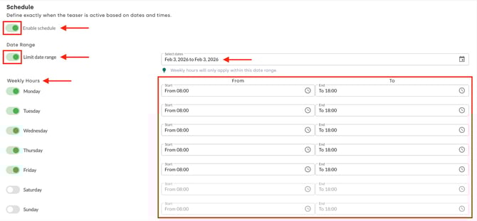 In the Weekly Hours area, define individually for each day of the week whether the teaser should be displayed. This is activated using the respective toggle next to the day of the week, e.g. Monday to Friday, as shown in the image below.