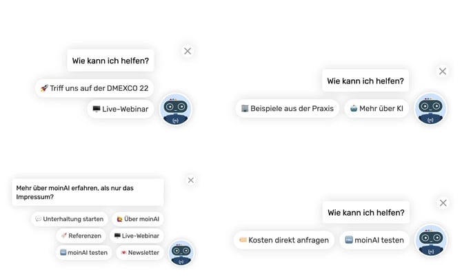 On the one hand, the teaser consists of a text message such as ‘How can I help you?’, which attracts the attention of website visitors. On the other hand, action buttons can be created that suggest chatbot topics and questions to users that are relevant to the page.