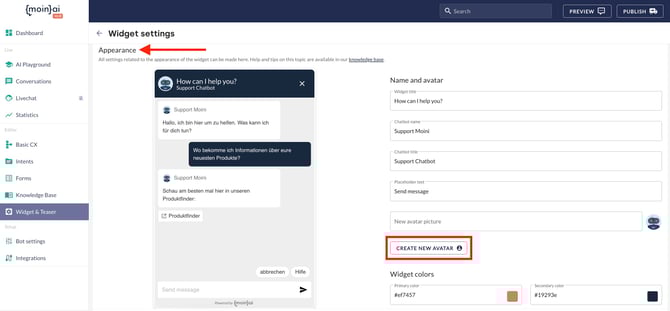 1. In the Apperance section, click on the Create new avatar button.