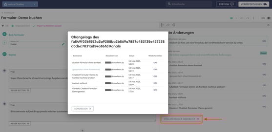 Das Änderungsprotokoll wird über das Seitenleisten-Symbol und einem anschließend Klick auf das Uhr-Symbol geöffnet. Dort sind sämtliche Änderungen am Formular dokumentiert.