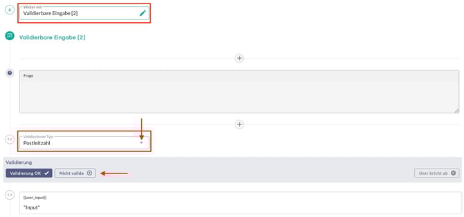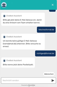 Validierbare Eingaben sind Informationen, die auf Bedingungen geprüft werden. Eine Eingabe ist entweder valide (erfüllt die Bedingungen) oder invalide (erfüllt sie nicht). Entspricht die Eingabe nicht den Bedingungen, fordert der Chatbot die Nutzer:innen zu einer korrekten Eingabe auf.