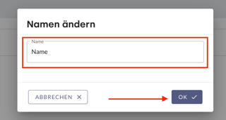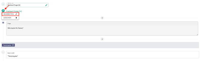 Der generische Name „Freitext Frage [6]“ für den Abfrageschritt ist anpassbar. Dies hilft bei der Wiedererkennung und Handhabung der Formular-Schritte. Mit einem Klick auf das Symbol neben dem Namen und anschließend auf Bearbeiten öffnet sich die Eingabemaske für die Umbenennung. Mit Ok wird die neue Bezeichnung übernommen.