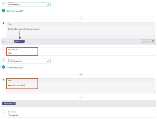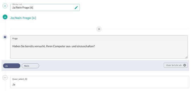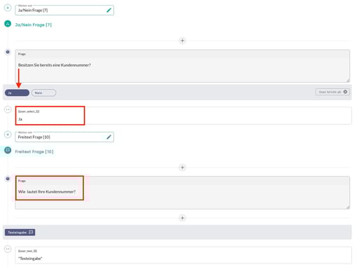 Im folgenden Beispiel wird eine Abfrage zur Erfassung der Kundennummer umgesetzt. Ziel ist die Zuordnung von Anfragen zu bestehenden Kundendaten oder Vorgängen. Bei Auswahl der Option Ja erfolgt die Eingabeaufforderung für die Kundennummer. Wird Nein ausgewählt, wird alternativ der Name abgefragt.