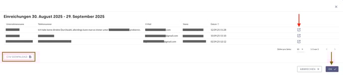 - Leads: Übersicht zu Formularen mit Eingaben in den jeweiligen Abschnitten. Ein Klick auf das Symbol Rechteck-mit-Pfeil ermöglicht die vollständige Formularansicht. Mit dem Button CSV Download ist ein Download aller Informationen als CSV-Datei möglich.