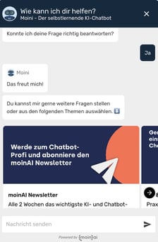 - Mit der Auswahl des Happy Paths wird diese Anschlussoption übernommen und im KI-Chatbot ausgespielt.