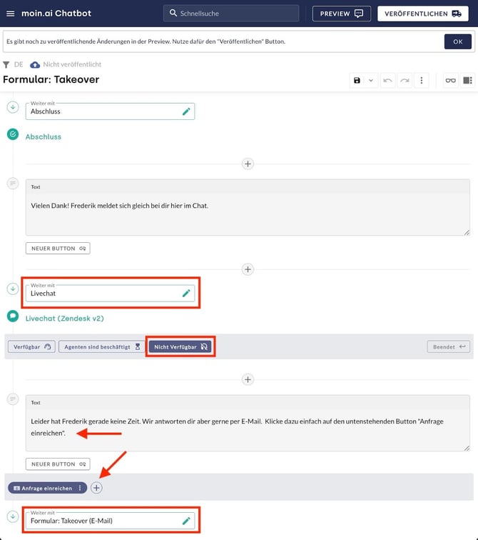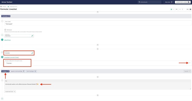 Dient das Formular der Qualifizierung eines komplexen Anliegens, das abschließend von einem Menschen bearbeitet wird, kann der Übergang an den Livechat eingerichtet werden. Dadurch werden Nutzer:innen direkt mit einem Service-Mitarbeitenden verbunden. Die Verknüpfung des Livechats mit dem Formular erfolgt folgendermaßen:
