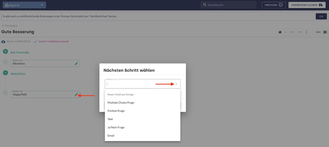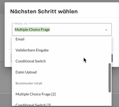 - Mit Klick auf das Stift-Symbol öffnet sich das Fenster Nächsten Schritt wählen. Hier erfolgt die Auswahl des Conversational Design Elements.
