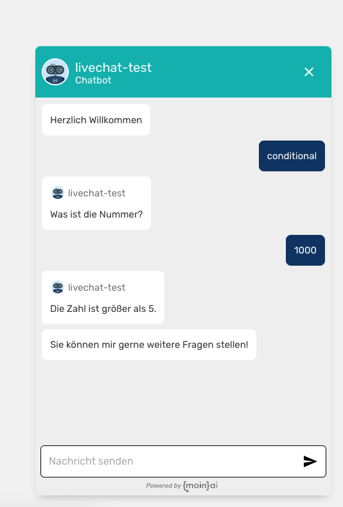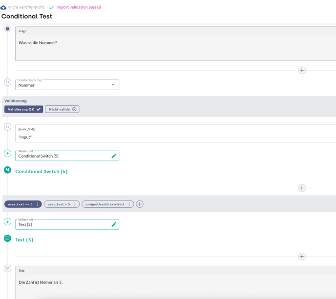 Die Entscheidungslogik basiert auf der Auswertung hinterlegter Werte. Dabei werden Eingaben der Nutzer:innen, über addContext gespeicherte Kontextinformationen sowie Ergebnisse aus Webhook-Abfragen mit den hinterlegten Werten verglichen. Der Abgleich erfolgt anhand definierter Kriterien, z. B. der Existenz eines Werts, einer Prüfung auf Gleichheit, Ungleichheit, größer oder kleiner als ein bestimmter Wert.