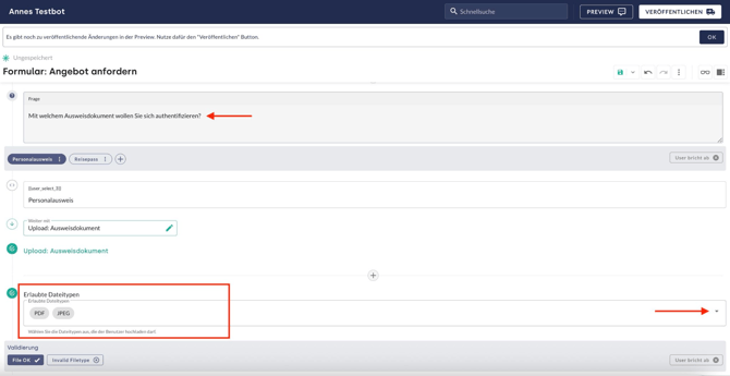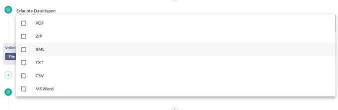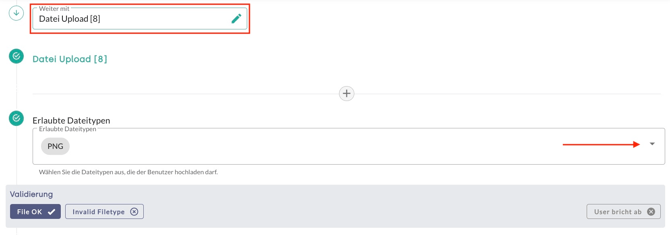 Um zu verhindern, dass unbrauchbare Dateitypen hochgeladen werden, sollte hier die Auswahl definiert werden. Wird dann ein unzulässiger Dateityp hochgeladen, erhalten die Nutzer:innen die erneute Aufforderung zum Dateiupload. Erst wenn der zulässige Dateityp hochgeladen wurde, geht es im Formular weiter.