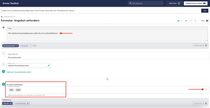Die Funktion Datei-Upload ermöglicht das Hochladen von Dateien im KI-Chatbot. Dateiuploads können z. B. das Hochladen eines Dokumentes (Personalausweis, Quittungen o.ä.) betreffen. Die Definition zulässiger Dateitypen erfolgt über das Dropdown-Menü unter Erlaubte Dateitypen.
