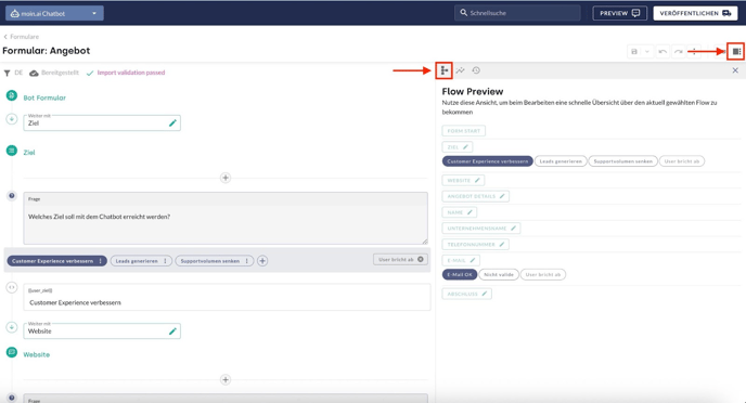 Mit einem Klick auf das Seitenleisten-Symbol öffnet sich die Flow Preview. Sie bietet eine kompakte Übersicht der Formular-Abschnitte.