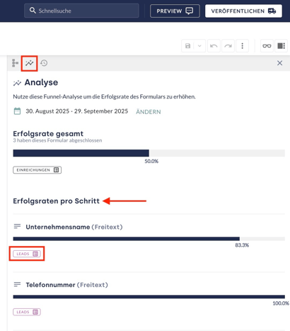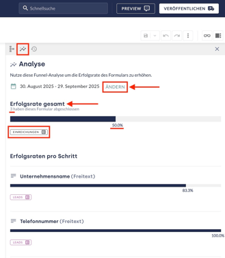 Die Analyse wird über das Seitenleisten-Symbol und einem anschließenden Klick auf das Liniendiagramm-Symbol geöffnet. Die Analyse zeigt die Erfolgsrate des Formulars an.