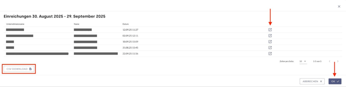 - Einreichungen: Auflistung aller vollständig ausgefüllten Formulare. Mit einem Klick auf das Rechteck mit dem Pfeil öffnet sich das komplette Formular. Mit dem Button CSV Download ist ein Download aller Informationen als CSV-Datei möglich.