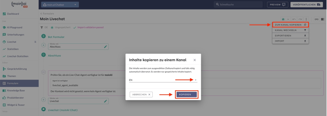 Die Funktion Zum Kanal kopieren ermöglicht das Kopieren eines Formulars in einen anderen Kanal des KI-Chatbots. Nach Auswahl der Option öffnet sich ein Fenster zur Auswahl des Zielkanals. Die Kopie wird mit einem Klick auf den Button Kopieren erstellt.