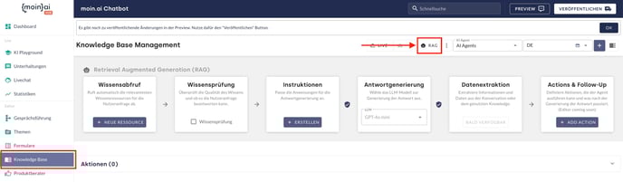 Der Aufruf des Bereichs erfolgt im Menüpunkt Knowledge Base über den Button RAG.