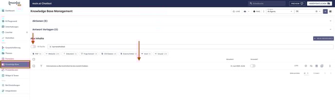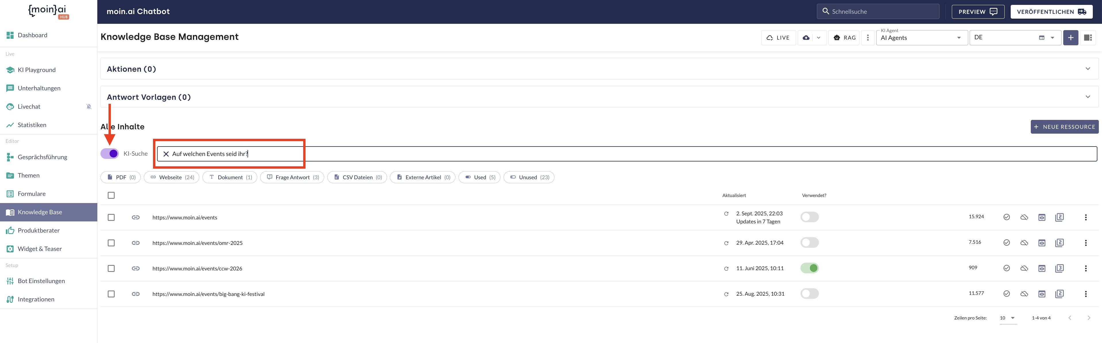 Ressourcen sind die Quellen für KI Agenten. In der Knowledge Base abgelegte Informationen bilden die Grundlage für die Antworten, die Agenten in der Kundenkommunikation geben. Das Ressourcenmanagement und die Steuerung der Agenten erfolgt im moinAI Hub.