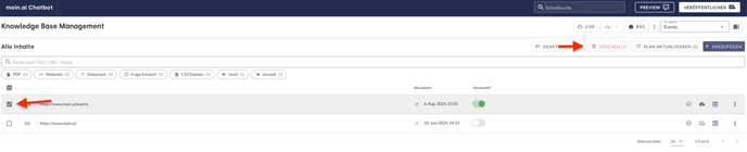 Sofern eine Ressource nicht mehr aktuell ist, ist das Ersetzen bzw. Deaktivieren dieser empfohlen, um das Ausspielen von veralteten Informationen zu verhindern. Im ersten Schritt ist auch hier die Auswahl des Agenten über das Auswahl-Menü notwendig. Sodann erfolgt das Deaktivieren über den Toggle in der Spalte Verwendet?.