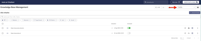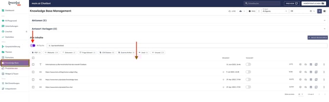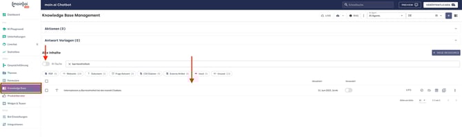 Der Aufruf des Bereichs erfolgt im Menüpunkt Knowledge Base über den Button RAG.