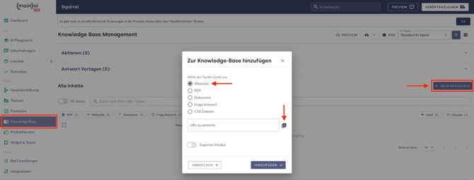 Im moinAI Hub ist es nicht nur möglich, Ressourcen wie Webseiten, PDFs oder CSV-Dateien in der Knowledge Base zu hinterlegen, sondern auch Artikel aus einer bereits bestehenden Wissensdatenbank zu nutzen. Die Anbindung einer externen Wissensdatenbank ist in diesem Artikel beschrieben.
