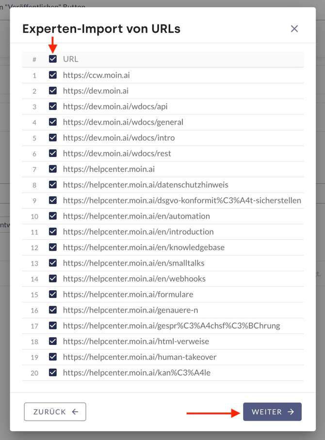 Der Massenimport von URLs ermöglicht das gleichzeitige Anlegen sämtlicher Subdomains einer Webseite. Dadurch wird der Import-Prozess beschleunigt und sichergestellt, dass alle relevanten Subdomains vollständig in der Knowledge Base hinterlegt sind.