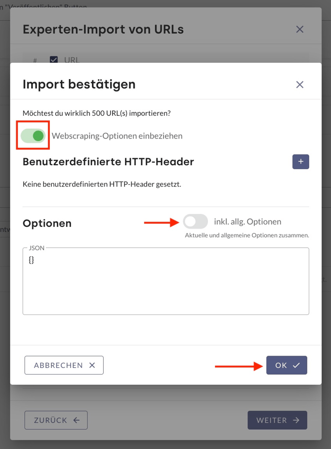 Über den Toggle Expertenoptionen besteht die Möglichkeit, konkrete Anweisungen zum Webseiten-Scraping im JSON-Format zu ergänzen.