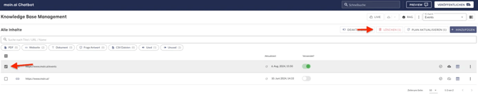 Sofern eine Ressource nicht mehr aktuell ist, ist das Ersetzen bzw. Deaktivieren dieser empfohlen, um das Ausspielen von veralteten Informationen zu verhindern. Im ersten Schritt ist auch hier die Auswahl des Agenten über das Auswahl-Menü notwendig. Sodann erfolgt das Deaktivieren über den Toggle in der Spalte Verwendet?.