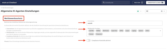 - Zusätzliche Compliance-Kontrolle: Führt eine explizite zweite Prüfung der Anfrage durch. In diesem Fall werden sowohl die inhaltlichen Guardrails als auch der Wettbewerbsschutz erneut geprüft. Die Funktion wird mit einem Klick auf den Toggle Compliance-Kontrolle aktiviert.