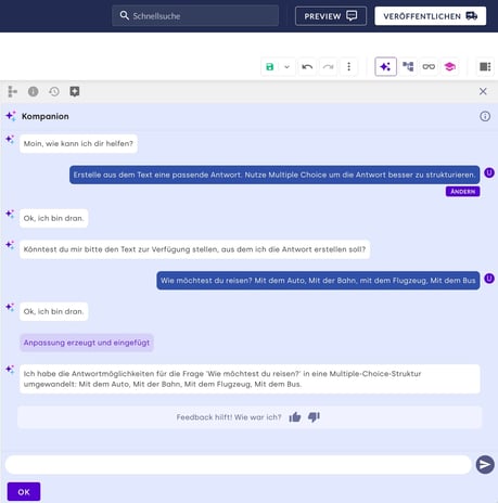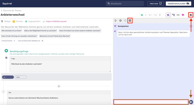 Der Button oben rechts im Editiermodus öffnet die Sidebar. Der Button mit dem Stern öffnet den redaktionellen Assistenten. Im geöffneten Chatfeld nimmt der Kompanion Befehle (Prompts) entgegen und assistiert bei der Gestaltung eines bestehenden Antwortkonzeptes.