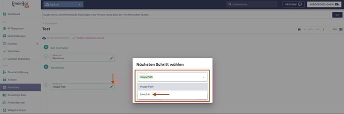If the form is used to qualify a complex issue that will ultimately be handled by a human being, the transition to live chat can be set up. This connects users directly to a service representative. The live chat is linked to the form as follows: