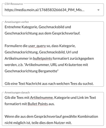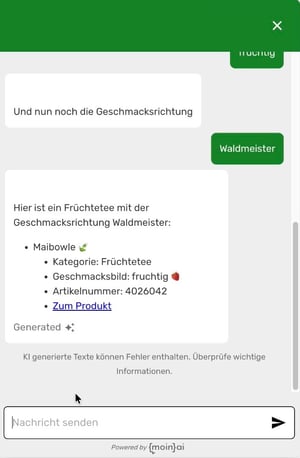 Anweisungen nachher (Ausgabe): „Gib die passenden Tees mit Artikelnummer, Kategorie und Link aus. Formatiere die Antwort in Stichpunkten. Falls die gewünschte Kombination nicht verfügbar ist, teile dies freundlich mit“.