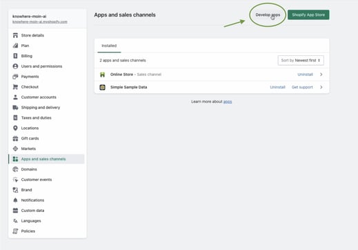 Öffne für die technische Integration die „Einstellungen/Settings” in Shopify und anschließend den Bereich „Apps and sales channels“.