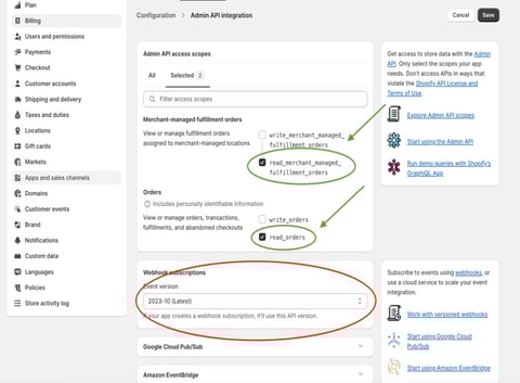 Hinweis: Aktiviere unter dem Menüpunkt „webhook subscriptions“ die „Event Version“ 2023-10 (Latest). Ansonsten kann es zu Fehlern kommen.