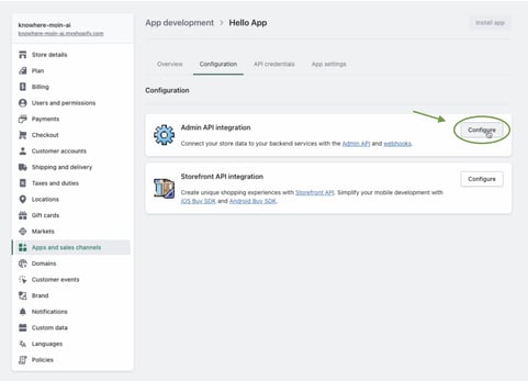 Wähle anschließend den Button „Configure“ unter „Admin API Integration“ aus.