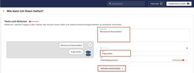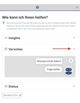 Zum einen besteht der Teaser aus einer Textnachricht wie z. B. „Wie kann ich Ihnen helfen?", welche die Aufmerksamkeit der Webseiten-Besucher:innen auf sich zieht. Zum anderen können Aktions-Buttons angelegt werden, die den Nutzer:innen passend zur Seite Chatbot Themen und Fragestellungen vorschlagen.