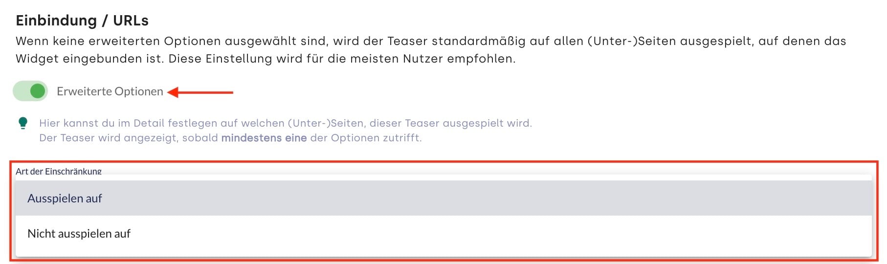 Ausspielen auf: Der Teaser wird nur auf Seiten ausgespielt, die eine der folgenden Regeln im Abschnitt erfüllt.