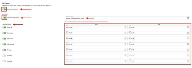 - Die Aktivierung der Funktion erfolgt über den Toggle Zeitplan aktivieren.