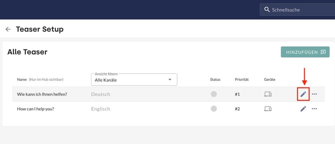Das Bearbeiten eines Teasers erfolgt über den Editor. Der Zugriff erfolgt über das Stift-Symbol neben dem Teaser.
