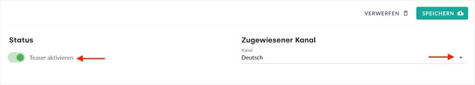 Über den Toggle im Bereich Status erfolgt die Aktivierung oder Deaktivierung des Teasers. Die Zuordnung zu einem Kanal kann hier ebenfalls verändert werden.