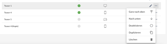 In der Liste über das Kontextmenü kann ein Teaser schnell und einfach dupliziert werden. Der neu erstellte Teaser ist zunächst deaktiviert, enthält sonst aber alle Inhalte und Einstellungen des ausgewählten Teasers.