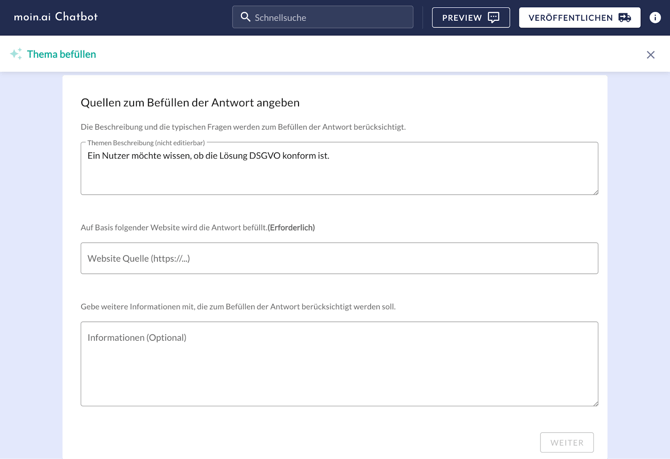 Im nächsten Schritt kann in der Eingabemaske eine URL hinterlegt werden. Basierend auf den Inhalten dieser Website werden mit generativer künstlicher Intelligenz Inhalte für vollständige Antworten als Entwurf erstellt.