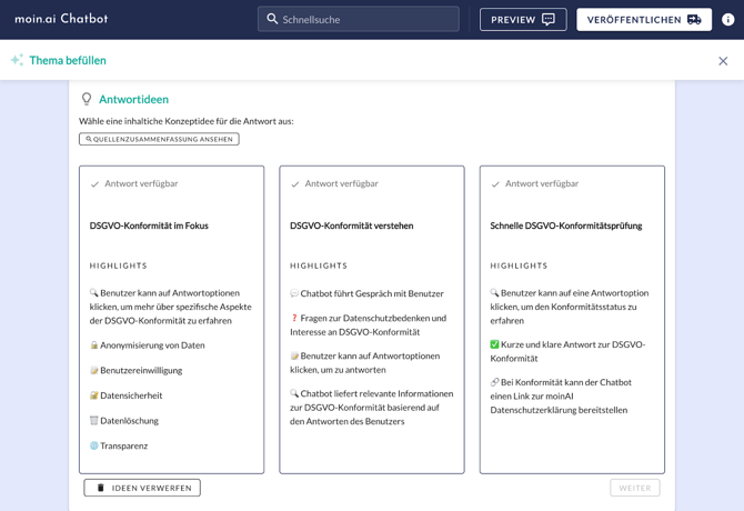 Der Fokus und eine stichpunktartige Zusammenfassung der Inhalte der drei Entwürfe werden angezeigt. Mit Klick auf Weiter werden die Antwort-Inhalte für das jeweilige Thema in den Inhalte-Editor übertragen.