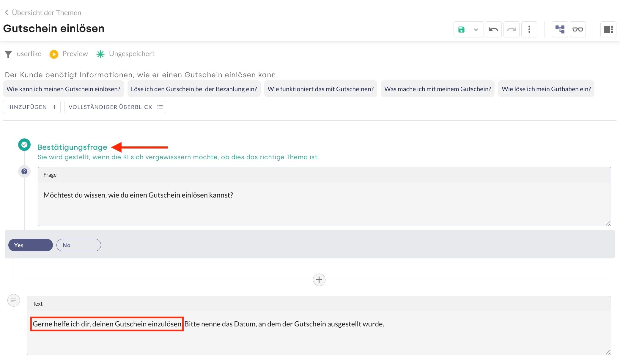 Die Bewertungsfrage sollte als Abschluss einer Antwort gewählt werden, wenn diese ein informatives Ziel hat, nämlich die Nutzer:innen mit Informationen zu versorgen. Mit der Bewertung (Ja oder Nein) kann anschließend die Qualität der Antwort gemessen werden.