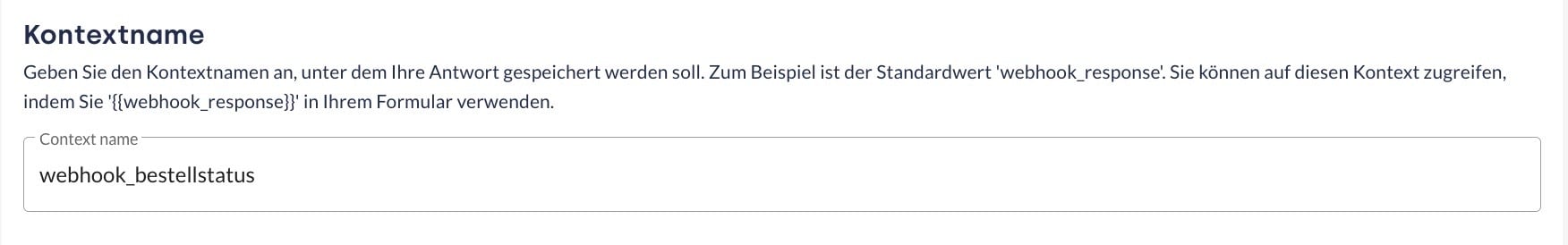 - Kontextname: Der Kontextname ermöglicht das Speichern der Antwort des Webhooks im Dialogkontext. Die Verwendung des Kontexts über Handlebars, z. B. , ist möglich.