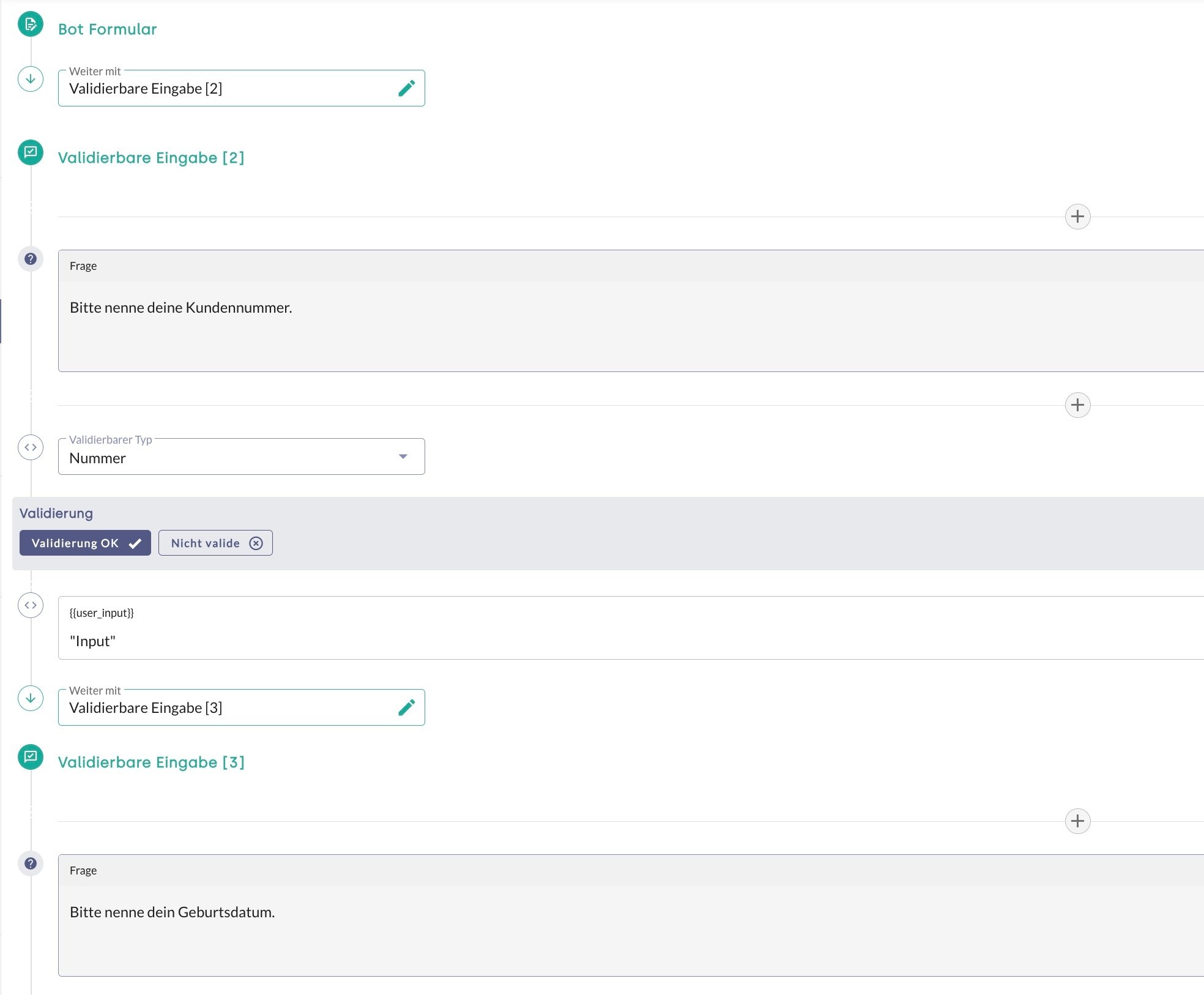 Der Zugriff auf den Dialogkontext ist stets via Templates (Handlebars) möglich, um z. B. abgefragte Daten wie Kundennummern oder andere benötigte Informationen an die API zu übermitteln. Gleichzeitig ist die Definition verschiedener Schritte im Formular möglich, so kann z.B. die Prüfung einer eingegebenen Kundennummer via Webhook druchgeführt werden. Das Ergebnis der Abfrage ist im Dialogkontext gespeichert, sodass ein Zugriff auf diese Information in den Folgeschritten möglich ist.