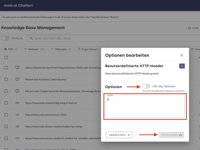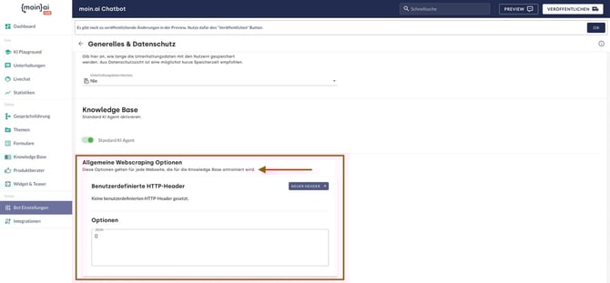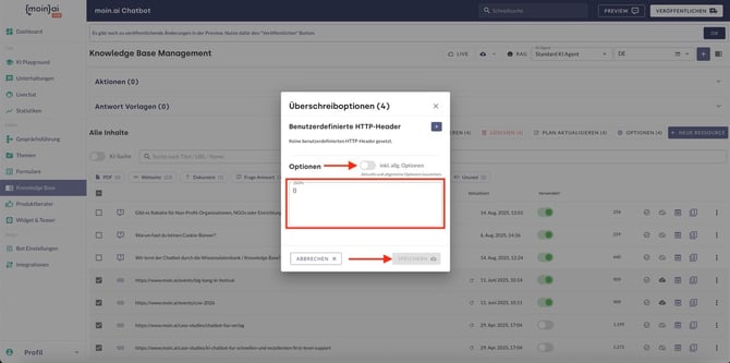 Im Folgenden werden einige Webscraping-Parameter für den Experten-Modus beim Hinzufügen von Ressourcen/Quellen in der moinAI Knowledge Base beschrieben. In diesem Artikel ist beschrieben, wie eine Ressource hinzugefügt wird.