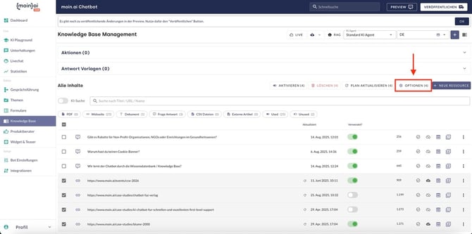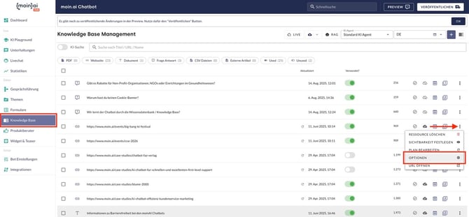 Webscraping Optionen für einzelne Ressourcen werden über den Menüpunkt Knowledge Base hinterlegt. Hierzu wird einzeln für jede Ressource über das Drei-Punkte-Menü hinten rechts an der Ressource auf Optionen geklickt.