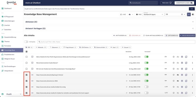 Für das Auslesen von Web-Ressourcen können im moinAI Hub Webscraping Optionen gesetzt werden. So werden relevante Inhalte ausgelesen und irrelevante Inhalte ausgeschlossen. So ist eine aufgeräumte und konkrete Datengrundlage sichergestellt.